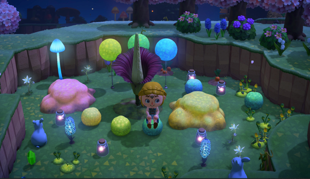Nestled behind the village, down a narrow path, you’ll find a Fairy Fountain. I used several items from the Glowing Moss set, and used blue hyacinth lamps to make the blue nightshades glow.