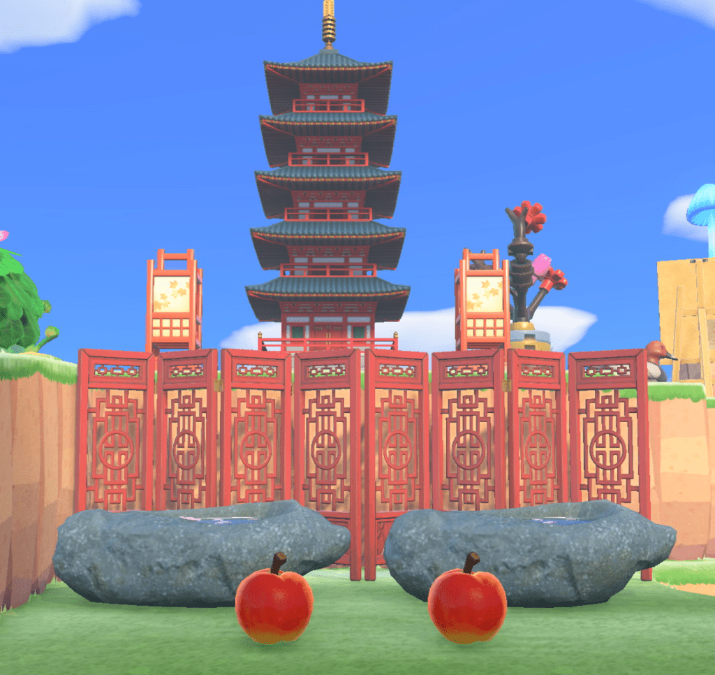 To make Impa’s house, I used the Pogada item, and two Paper Lanterns. I put it up on a level 2 cliff to give it height, adding some Imperial Partitions to hide the cliff face.