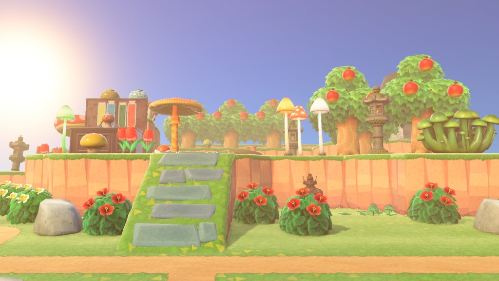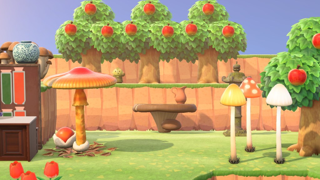 The village is at the height of CeCe’s Mushroom Mania! I love the mushroom furniture set so much, I think I used every piece of the set. Also, you can’t have Hateno village without apple trees!
