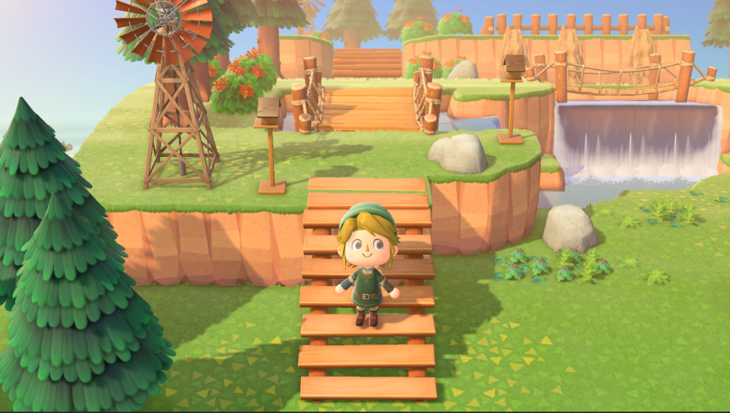 I combined the wooden staircase and the suspension bridge to simulate the drawbridges connecting the individual peaks of Rito Village. The Cedar trees and the Windmill item add to the Rito vibe,