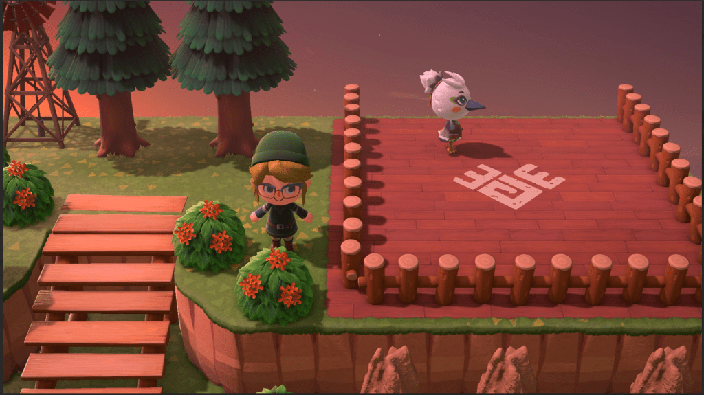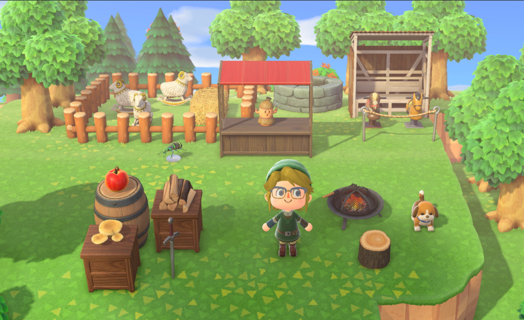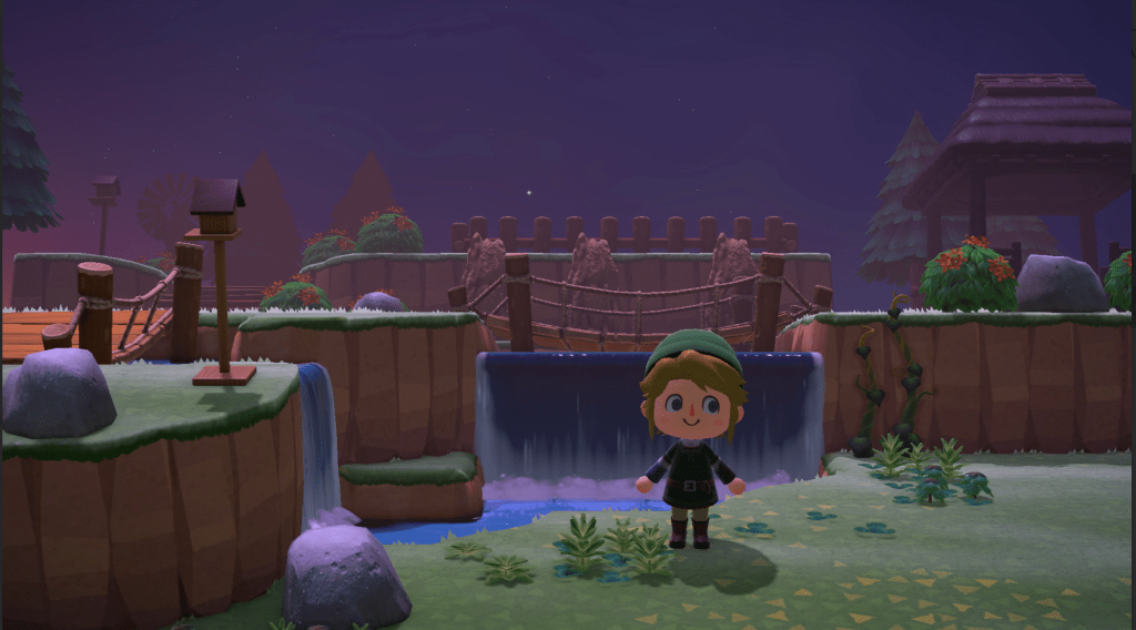 Make sure to stop and snag some hearty salmon from the pond on your way up to the store. Atop the hill, there is a customized Azumaya Gazebo item to approximate the Rito Village structures.