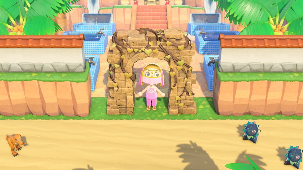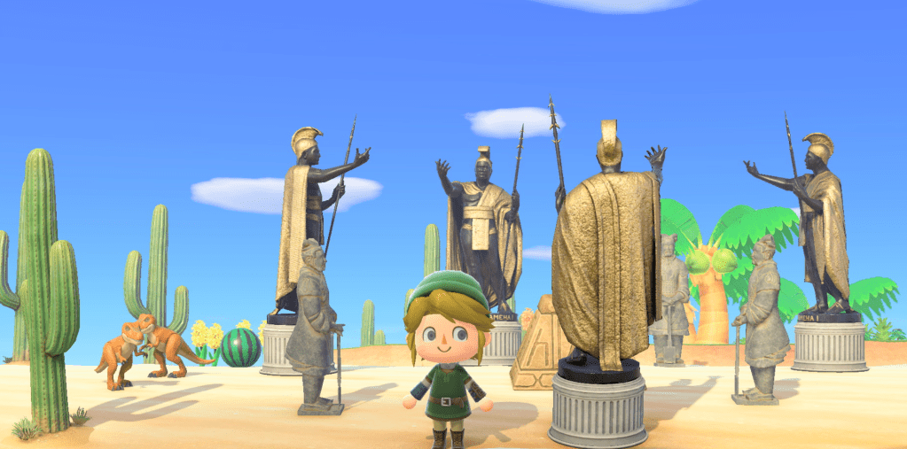 We head back out into the desert in search of the eighth heroine, making sure to have plenty of hydromelons (customized Beach Ball) on hand. Braving the peril of electric lizalfos (Dinosaur Toy), our quest leads us to the East Gerudo Ruins, where we find the statues of the heroines. I used the Great Statue, the Warrior Statue, and the Forbidden Altar for the shrine at the center.